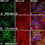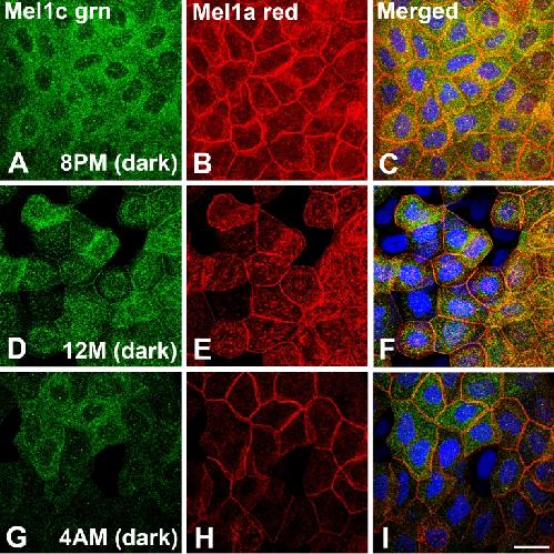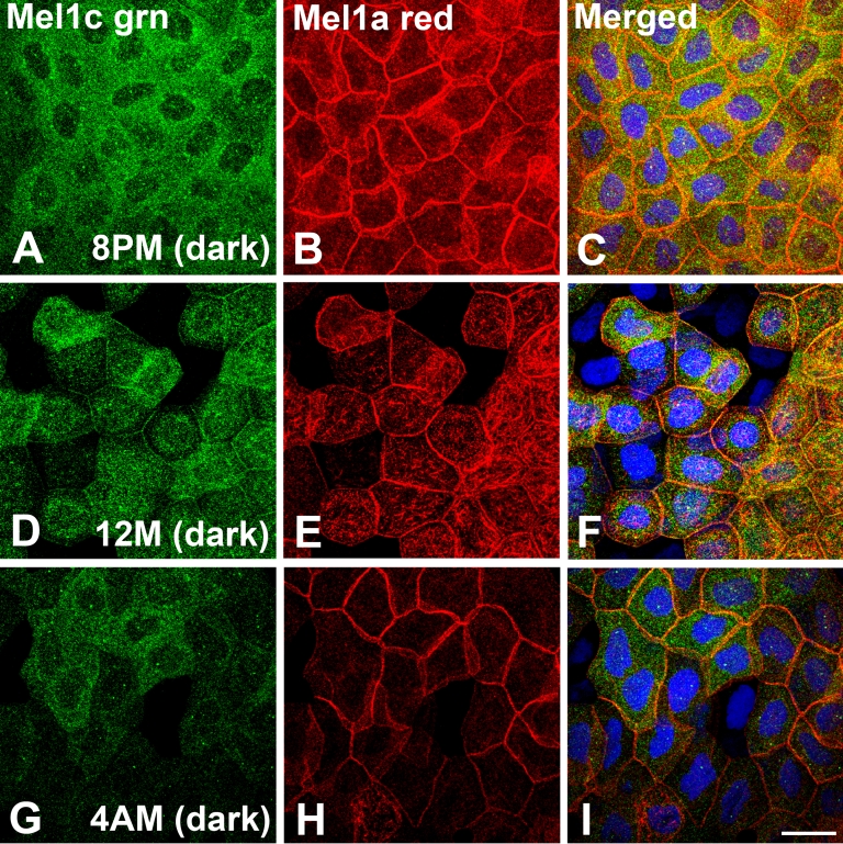 Figure 10. Mel1a and Mel1c immunocytochemistry of whole-mounted Xenopus laevis surface corneal epithelium obtained at 4-h intervals during a 24-h lightâdark cycle. Frogs were housed under a 12 h:12 h lightâdark cycle (6:00 AM: lights on; 6:00 PM: lights off). All tissues in this figure were obtained in the dark. Mel1c labeling is represented in green (A, D, and G) and Mel1a labeling is represented in red (B, E, and H). The yellow labeling in the merged images (C, F, and I) indicates regions of co-localization of the red and green signal. A-C: Corneas obtained at 8:00 PM (2 h after lights off). Mel1c immunolabeling is almost exclusively located in the cytoplasm, but there is intense Mel1a immunoreactivity present in the lateral membranes, and also in the cytoplasm. The cytoplasmic immunolabeling of Mel1a and Mel1c is not co-localized. D-F: Corneas obtained at 12:00 M (mid-dark). Most of the Mel1c immunoreactivity is in the cytoplasm, although some lateral membrane labeling is also detected. Mel1a immunoreactivity is predominant in the lateral membranes, but there are many irregular-appearing cytoplasmic compartments that express Mel1a immunoreactivity, and they do not co-localize with the Mel1c cytoplasmic labeling. Essentially, all Mel1clateral membrane labeling is co-localized with Mel1a membrane labeling. G-I: Corneas obtained at 4:00 AM (2 h before lights on). Most of the Mel1c immunoreactivity is located in the cytoplasm, with very little membrane labeling detected. Most of the Mel1a immunoreactivity is located on the lateral membranes, with some immunoreactivity also appearing in irregular cytoplasmic compartments. The Mel1a and Mel1c cytoplasmic labeling is not co-localized. Nuclei are stained with DAPI. The confocal images in all panels are comprised of three optical slices of 400 nm each in the z-series. The magnification bar (I) represents 20 µm.