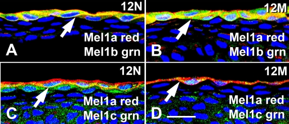 Figure 2. Mel1a, Mel1b, and Mel1c double-label immunocytochemistry of cryostat sections of Xenopus laevis corneal epithelium. A and C: Corneas obtained at 12:00 noon (12N) in the light. B and D: Corneas obtained at 12:00 midnight (12M) in the dark. Sections were immunolabeled with Mel1a and either Mel1b or Mel1c receptor antibodies. Mel1a labeling is represented in red, and Mel1b and Mel1c labeling is represented in green. Yellow indicates regions of co-localization of the red and green signal. Melatonin receptors are expressed in the surface epithelium, but their relative levels of expression and distribution change between 12N and 12M. Arrows indicate the immunolabeled plasma membranes of the surface epithelium. Nuclei are stained with DAPI. The magnification bar (D) represents 20 µm.