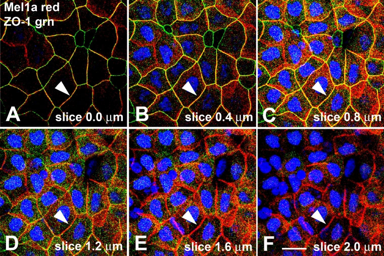 Figure 8. Localization of ZO-1 and Mel1a in progressive confocal optical slices of Xenopus corneal epithelium. A: Image of the most superficial surface of the surface corneal epithelium. In the most apical slice (slice 0.0 µm), red Mel1a, green ZO-1, and merged yellow labeling is observed in variable amounts on different cell membranes. B-F: As the 0.4-µm slices progress deeper into the corneal epithelium layer, the green ZO-1 immunoreactivity gradually lessens, whereas the red Mel1a immunoreactivity increases (note arrowheads indicating an example of this), indicating that the Mel1a receptor is located basal to the zonula adherens, but is in very close proximity in most of the slices (A-C). Nuclei are stained with DAPI. The magnification bar (F) represents 20 µm.