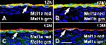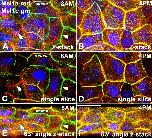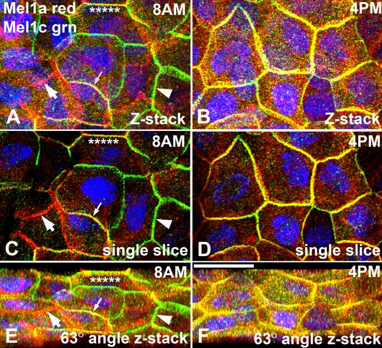 Figure 11. Confocal analysis of Mel1a and Mel1c immunocytochemistry of whole-mounted Xenopus laevis surface corneal epithelium at two separate time points. Three-dimensional reconstructions of confocal z-stacks of optical slices of the 8:00 AM (A, C, and E) and 4:00 PM (B, D, and F) specimens were rotated at 63° on the x-axis to enable optimal viewing of the pattern of immunolabeling. At 8:00 AM (A, C, and E), areas of lateral membranes express only the red Mel1a receptor label (large arrow) or the green Mel1c receptor label (large arrowhead). In some areas of merged Mel1aÂ-Mel1c co-localization, only the yellow color is observed (small arrow), indicating receptor co-localization. There are also areas of membrane that express the yellow co-localization but have small areas of red Mel1a or green Mel1c label interdigitated with the yellow label (asterisks). At 4:00 PM (B, D, and F), the lateral membranes show a more uniform pattern of immunolabeling than observed at the 8:00 AM time point. The yellow co-localization label is predominant in the most apical portion of the membranes, but in the more basal area of the lateral membranes distinct punctate red Mel1a and green Mel1c labeling is also observed. Nuclei are stained with DAPI. The confocal images in panels A and E are comprised of 16 optical slices of 400 nm each in the z-series. The confocal images in panels B and F are comprised of 16 optical slices of 400 nm each in the z-series. The images in panels C and D are comprised of a single optical slice of 400 nm. The magnification bar (F) represents 20 µm.
