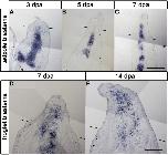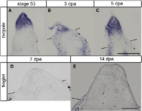 Fig. 4. Expression of cartilage maker gene, sox9, in tadpole and froglet blastemas. Limbs were amputated at the ankle level of tadpolehindlimb bud (AâC) or at the wrist level of froglet forelimb (D, E). (A) Expression in tadpole 3 days post amputation (dpa) blastema. Expression was observed in the proximal to amputation plane but not in the blastema. (B) Expression in tadpole 5 dpa blastema. Expression was observed in the proximal to amputation plane but not in the blastema. (C) Expression in tadpole 7 dpa blastema. Expression was observed distal and proximal to the amputation plane. (D) Expression in froglet 7 dpa blastema. Expression was observed in the blastema. (E) Expression in froglet 14 dpa blastema. Expression was observed in a broad region of the blastema. Lines indicate the estimated amputation planes. Distal is to the top in all figures. Scale bar = 400 μm.