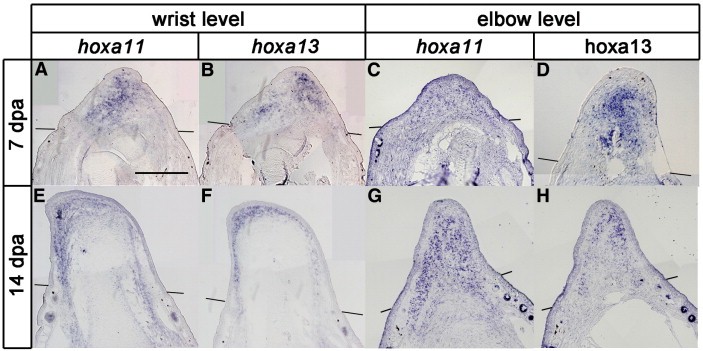 Fig. 3. hoxa11 and hoxa13 expressions in froglet blastemas. Blastemas were derived from amputation at the wrist level (A, B, E and F) or at the elbow level (C, D, G and H). (A, C) hoxa11 expression in 7 days post amputation (dpa) blastema. (B, D) hoxa13 expression in 7 dpa blastema. (E, G) hoxa11 expression in 14 dpa blastema. (F, H) hoxa13 expression in 14 dpa blastema. Note that hoxa11 and hoxa13 were reexpressed in the froglet blastema, but expression domains were never separated. Lines indicate the estimated amputation planes. Distal is to the top in all figures. Scale bar = 400 μm.