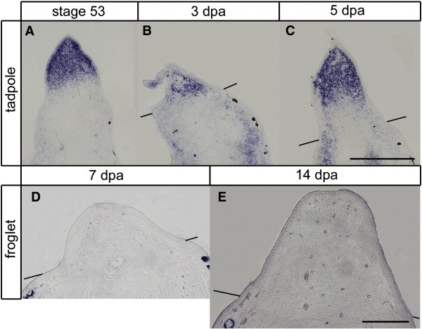 Fig. 6. Expression of EphA4 in limb bud and tadpole and froglet blastemas. Blastemas were derived from the ankle level of tadpolehindlimb bud (B, C) or at the wrist level of froglet forelimb (D, E). (A) Expression in stage 53 limb bud. (B) Expression in tadpole 3 dpa blastema. (C) Expression in tadpole 5 dpa blastema. (D) Expression in froglet 7 dpa blastema. (E) Expression in froglet 14 dpa blastema. Note that expression is not observed in the froglet blastema. Lines indicate the estimated amputation planes. Distal is to the top in all figures. Scale bar = 400 μm.