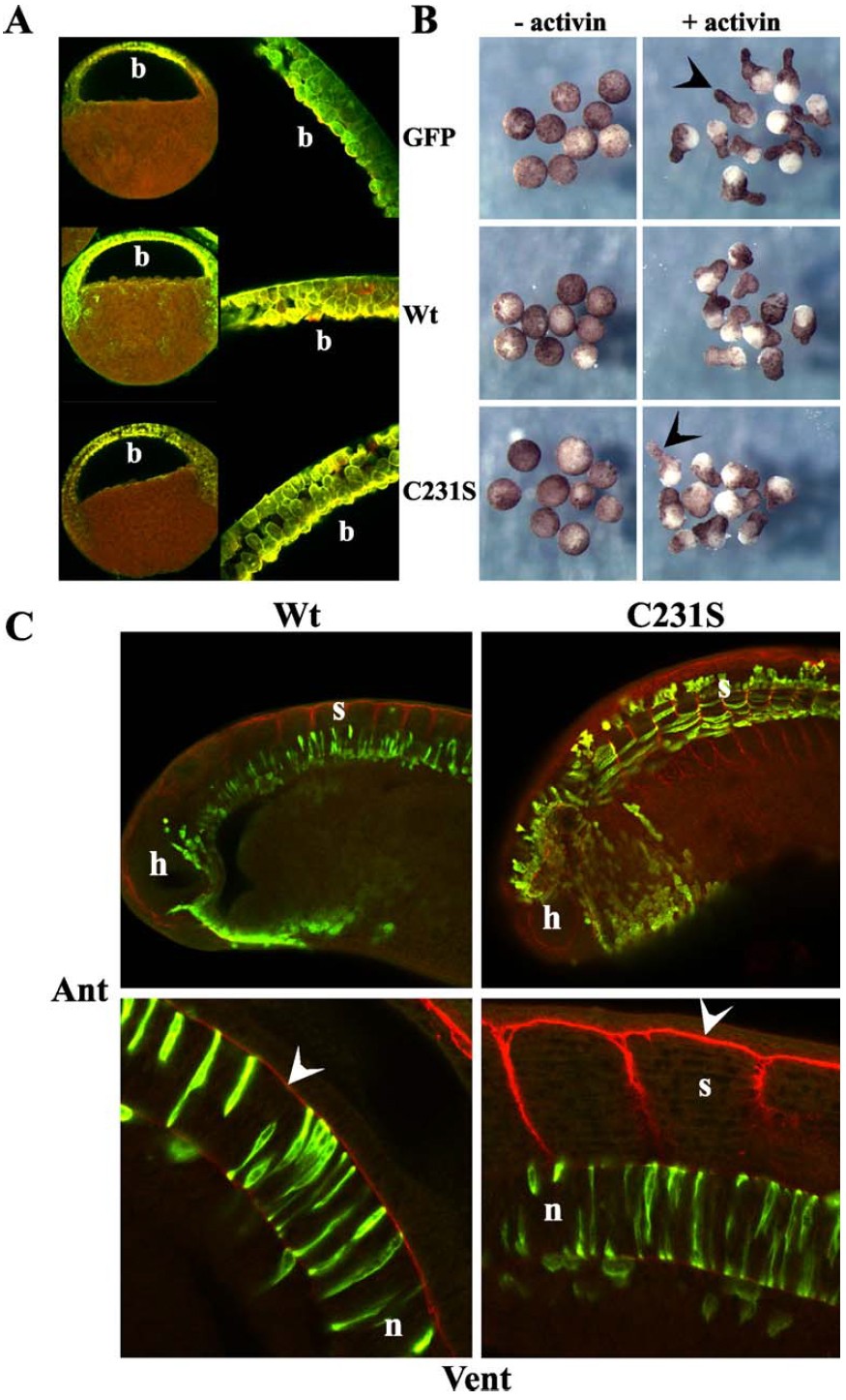 C231S fail to close their blastopores (white double arrows) and their notochords (n) are shorter than the control (black vertical bar), indicating that gastrulation