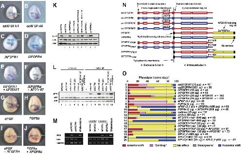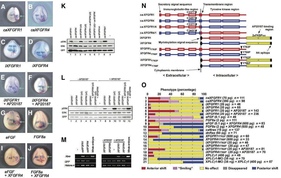 Fig. 4. Competition for ligands between XFGFR1 and XFGFR4 regulates the development of the anterior neural region. (A,B) caXFGFR1 mRNA and XFGFR4 mRNA shifted Xpax2 expression anteriorly. (C-F) iXFGFR mRNA shifted Xpax2 expression anteriorly when AP20187 was added at stage 10 to dimerize the iXFGFRs. (G-J) When XFGFR4 mRNA was coinjected, the effect of FGF overexpression (reduced size of the anterior neural structure in a cell-autonomous manner; G,H) disappeared, and Xpax2 expression was shifted posteriorly (I,J). (K,L) ERK assay in animal caps injected with mRNAs encoding caXFGFRs and iXFGFRs. caXFGFR mRNA- and GFP mRNA-injected caps excised from blastulae were incubated at 23oC for 110 min (K). AP20187 was added to iXFGFR mRNA- and GFP mRNA-injected caps at stage 10, and the caps were incubated at 23oC for an additional 110 min (L). Cell lysates were analyzed by western blotting for phosphorylated ERK (pERK), pan-ERK, and GFP. (M) Induction of Xbra expression in animal caps injected with mRNAs encoding caXFGFRs and iXFGFRs. AP20187 was added at stage 9 for dimerization of iXFGFRs. RNA for RT-PCR analysis was extracted at stage 11. (N) Structures of caXFGFRs, iXFGFRs and their derivatives. (O) Summary of injections.