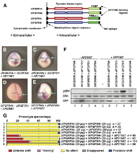 Fig. 6. Heterodimers between the intracellular domains of XFGFR1 and XFGFR4 activate for signaling. (A) Constructs for inducible heterodimerization. (B-D) Heterodimers between XFGFR1-ICD and XFGFR4-ICD as well as homodimers of XFGFR1-ICD shifted Xpax2 expression anteriorly. (E) The positioning of Xpax2 expression was unaffected by AP21967-induced homodimerized XFGFR4-ICD. (F) ERK assay in animal caps injected with different combinations of XFGFR-ICD mRNAs. Dimerization was induced by AP21967 at stage 10. (G) Summary of injections.