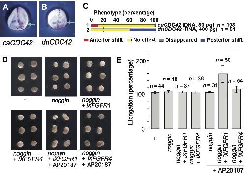 Fig. 7. Involvement of convergent extension in the positioning of Xpax2 expression and the differential activities of the ICDs of XFGFR1 and XFGFR4. (A,B) Xpax2 expression was shifted anteriorly by caCDC42 under the regulation of a CMV promoter (A), whereas dnCDC42 mRNA induced a posterior shift (B). (C) Summary of injections of CDC42 constructs. (D,E) Dimerization of iXFGFRs was induced by AP20187 at stage 11.5 in animal caps that had been injected with noggin mRNA. Cap elongation was assessed based on the ratio of the maximum width to the minimum width of the cap at stage 19 (E). Data are expressed as means +/- s.d.