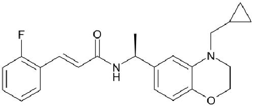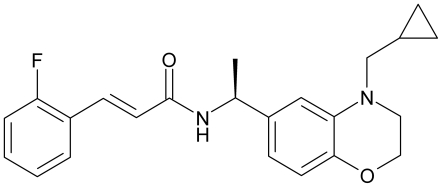 (S)-N-[1-(4-cyclopropylmethyl-3,4-dihydro-2H-benzo[1,4]oxazin-6-yl)-ethyl]-3-(2-fluoro-phenyl)-acrylamide is a potent and efficacious KCNQ2 opener which inhibits induced hyperexcitability of rat hippocampal neurons.