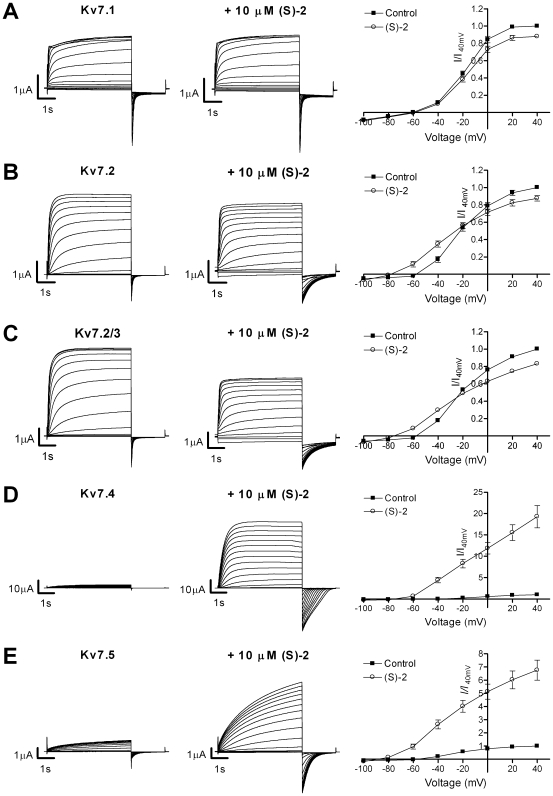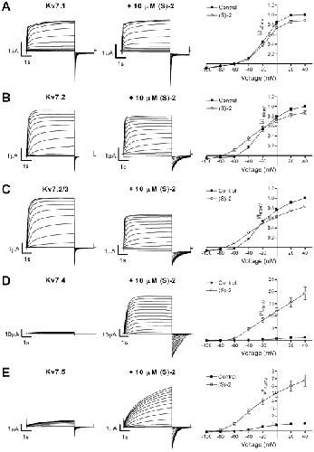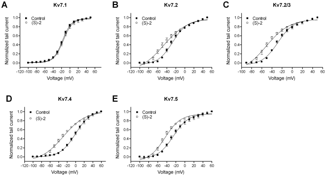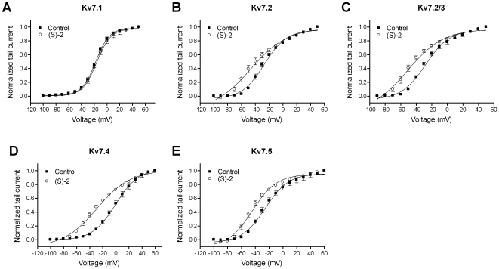 Figure 3. Effect of (S)-2 on the voltage-dependence of activation.Tail currents measured for Kv7.1 (A), Kv7.2 (B), Kv7.2/Kv7.3 (C), Kv7.4 (D) and Kv7.5 (E) after stepping back to −120 mV from 5 s long potentials between –100 and +60 mV were normalized and plotted against the preceding potential in the absence and presence of 10 µM (S)-2. The tail current-voltage relationship was then fitted to the Boltzmann equation (Eq. 1) to yield half-activation potentials (V0.5). Bars represent S.E.M. and n = 5–11.