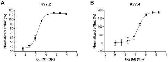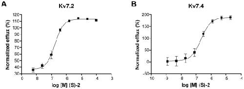 Figure 4. Potency of (S)-2 on Kv7.2 and Kv7.4.Dose-response relationship for the effect of (S)-2 on (A) Kv7.2 (n = 6) and (B) Kv7.4 (n = 8) measured using an 86Rb-flux assay.