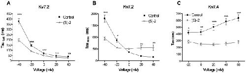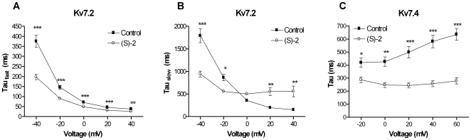 Figure 5. Effect of (S)-2 on the activation kinetics of Kv7.2 and Kv7.4.For determination of activation kinetics, current traces recorded during 5 s voltage steps from –80 mV to potentials between –40 and +40 mV for Kv7.2 in the absence and presence of (S)-2 were fitted to a double exponential function and the time constants τfast (A) and τslow (B) obtained were plotted against the step potential. For Kv7.4 current traces recorded during 5 s voltage steps to potentials between –20 and +60 mV were fitted to a single exponential function and τ is plotted against the step potential (C). Asterisks indicate statistical significant difference between absence and presence of (S)-2 determined by two-way ANOVA followed by Bonferroni post-test. * P<0.05, ** P<0.01 and *** P<0.001. Bars represent S.E.M. and n = 8-13.