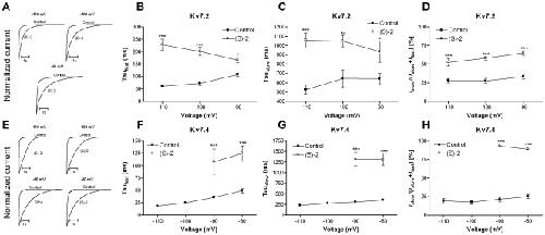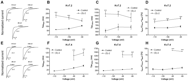 Figure 6. Effect of (S)-2 on the deactivation kinetics of Kv7.2 and Kv7.4.Normalized tail current traces for Kv7.2 (A) and Kv7.4 (E) obtained at the indicated potentials in the absence and presence of (S)-2 illustrating the pronounced effect of the compound on the deactivation kinetics. Deactivation kinetics for Kv7.2 were determined by fitting the tail currents measured at potentials between –110 mV and –90 mV after an activating step to +40 mV to a double exponential function. The time constants τfast (B) and τslow (C) were plotted against the potential. (D) Relative contribution of the slow component of the deactivation kinetics for Kv7.2. Tail currents measured between −110 and −80 mV for Kv7.4 were fitted to a double exponential function and τfast (F) and τslow (G) were plotted against the potential. (H) Relative contribution of the slow component of the deactivation kinetics for Kv7.4. Asterisks indicate statistical significant difference between absence and presence of (S)-2 determined by two-way ANOVA followed by Bonferroni post-test. * P<0.05, ** P<0.01 and *** P<0.001. Bars represent S.E.M. and n = 5–14.