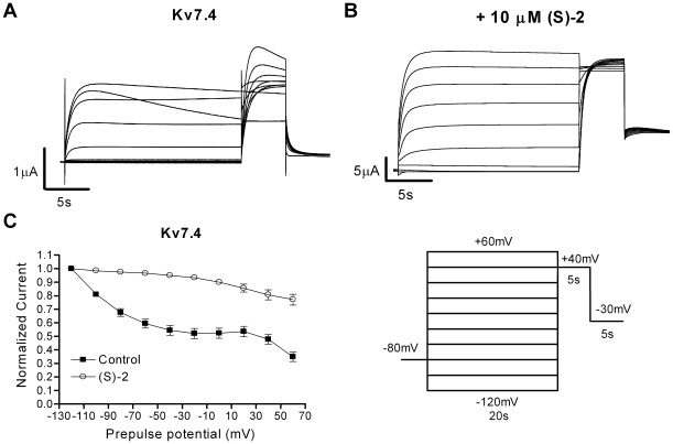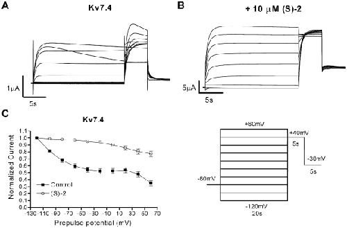Figure 7. Effect of (S)-2 on the inactivation of Kv7.4.Representative two-electrode voltage-clamp recordings elicited by the voltage protocol shown in the inset in the absence (A) and presence (B) of 10 µM (S)-2. (C) The degree of inactivation in the absence and presence of (S)-2 is revealed by plotting the current amplitude measured at +40 mV normalized to the level measured after a prepulse potential of –120 mV as a function of the preceding prepulse potential. Bars represent S.E.M. and n = 11–14.