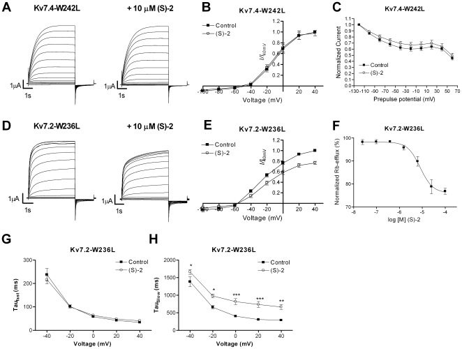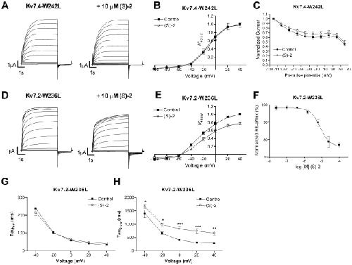 Figure 8. Dependency of (S)-2 on a tryptophan residue in S5.Representative two-electrode voltage-clamp current traces of Kv7.4-W242L (A) and Kv7.2-W236L (D) in the absence (left) and presence (right) of 10 µM (S)-2. Currents were elicited by 5 s depolarizing pulses between −100 and +40 mV in 10 mV increments from a holding potential of –80 mV followed by a 2 s step to –120 mV. The steady state peak current amplitudes of Kv7.4-W242L (B) and Kv7.2-W236L (E) in the absence and presence of 10 µM (S)-2 were normalized against the current at +40 mV in control recordings and plotted against the test potential to obtain current-voltage (I-V) curves (n = 10). (C) Cells expressing Kv7.4-W242L were investigated for inactivation by the same voltage protocol as in fig. 7. The plot shows the current amplitude measured at +40 mV normalized to the level measured after a prepulse potential of –120 mV as a function of the preceding prepulse potential, n = 11. (F) Dose-response relationship of the effect of (S)-2 on Kv7.2-W236L measured using a Rubidium-flux assay (n = 4). Effect of (S)-2 on the fast (G) and slow (H) components of the activation kinetics of Kv7.2-W236L. Current traces recorded during voltage steps from –80 mV to potentials between –40 and +40 mV in the absence and presence of (S)-2 were fitted to a double exponential function and the time constants τfast and τslow obtained were plotted against the step potential (n = 7). * P<0.05, ** P<0.01 *** P<0.001 determined by two-way ANOVA followed by Bonferroni post-test. Bars represent S.E.M.