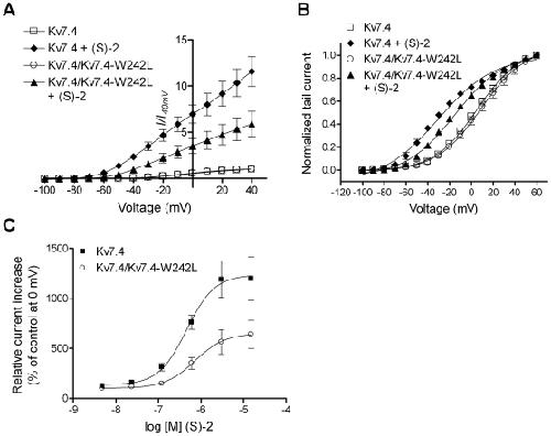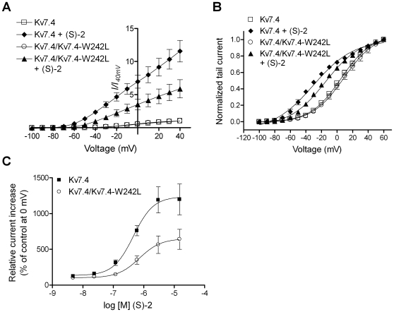 Figure 9. Sensitivity of heteromeric Kv7.4/Kv7.4-W242L channels to (S)-2.(A) Current-voltage (I-V) relationship of Kv7.4 and Kv7.4/Kv7.4-W242L in the absence and presence of 15 µM (S)-2. The steady state peak current measured at potentials between –100 and +40 mV were normalized against the current at +40 mV in control recordings and plotted against the test potential. (B) Effect of (S)-2 on the voltage-dependence of activation of Kv7.4 and Kv7.4/Kv7.4-W242L. Tail currents measured after stepping back to –120 mV from potentials between –100 and +60 mV in the absence and presence of 15 µM (S)-2 were normalized and plotted against the preceding potential. The tail current-voltage relationship was then fitted to the Boltzmann equation to yield half-activation potentials (V0.5): Kv7.4 (5.1±1.3 mV); Kv7.4+(S)-2 (−30.5±1.6 mV); Kv7.4/Kv7.4-W242L (4.1±1.6 mV); Kv7.4/Kv7.4-W242L+(S)-2 (−15.0±1.0 mV). (C) Dose-response relationship of (S)-2 on Kv7.4 and Kv7.4-W242L. The steady state peak currents elicited by a 5 s step to 0 mV in response to increasing concentrations of (S)-2 were normalized to the current in the absence of compound and plotted as a function of the concentration of (S)-2. The values were then analyzed by non-linear regression to fit a sigmoidal curve. The EC50 values were determined to 0.46 µM and 0.72 µM and the Hill coefficients to 1.32±0.17 and 1.24±0.25 for Kv7.4 and Kv7.4/Kv7.4-W242L, respectively. Bars represent S.E.M. and n = 6–10.