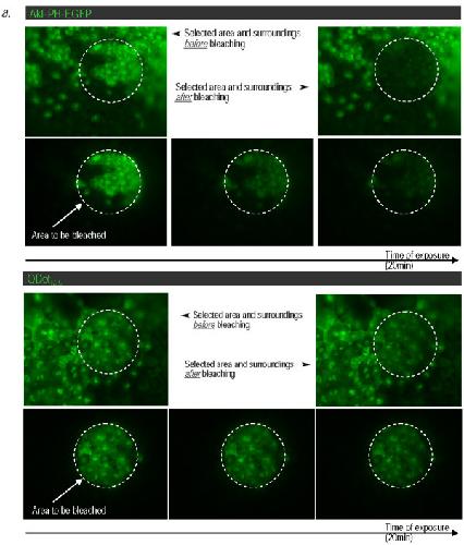 Figure 3. QD-Akt-PH conjugates are resistant to photobleaching, unlike Akt-PH-EGFP fusions. Fluorescence images of stage 10 Xenopus embryos microinjected with the probe (IC-QD525) and with RNA encoding the target protein (Akt PH-EGFP-IN), both shown in green since their emission spectra are closely matched. Embryos were exposed to continuous excitation (~ 480 nm) for > 20 min. This led to gradual loss of the EGFP signal but did not affect the QDot525 signal.