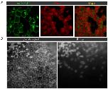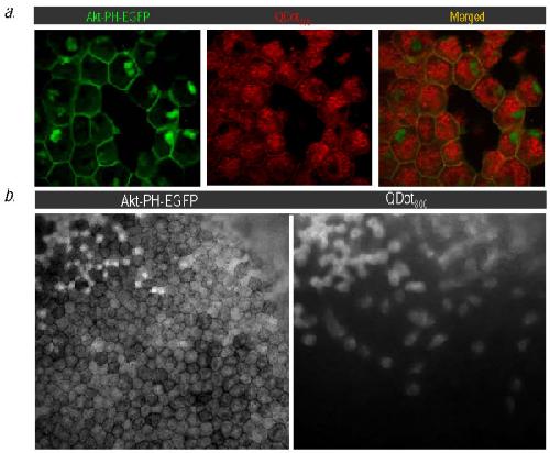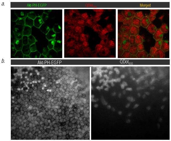 Figure 4. Increased NIR-QDot size imposes constraints on Akt-PH-QD conjugate translocation efficiency but NIR-QD's allow visualization in deeper cell layers in a live Xenopus embryo, unlike Akt-PH-EGFP (a) Co-localization of QDot705 with Akt-PH-EGFP on the cell membrane. Note that unlike the QDot585, the QDot705 are not recruited as effectively to the cell membrane. (b) QDot800 allow visualization of the Akt-PH ~ two to three layers below the superficial cell layer, where the GFP signal was either undetectable or too diffuse. The images are of the same region of the embryo imaged with a GFP (left) and a QDot800 (right) filter set.