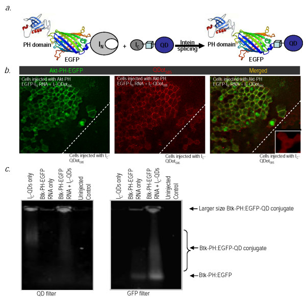 Figure 1. In vivo conjugation of QD's to Akt-PH-EGFP via intein mediated protein splicing. (a) Schematic representation of site-specific intein-mediated conjugation of QD's to target protein. (b) Co-localization of QDot585 with Akt-PH-EGFP on the cell membrane. Fluorescence images of stage 10 Xenopus embryos microinjected with the probe (IC-QDot585) shown in red, in one blastomere at the two-cell stage, and then injected with RNA encoding the target protein (Akt PH-EGFP-IN) shown in green, in three of four blastomeres. Yellow shows the overlap between red QDot585 and green EGFP indicating successful QD-protein conjugation in a live embryo. (c) Biochemical characterization of protein-QD conjugates. Xenopus embryos were injected with either probe (Ic-QD's) only or Btk-PH-EGFP-IN RNA only or both, lysed at stage 10 and loaded onto a 0.5% agarose gel. QDot655 were visualized with a band pass 650/30 emission filter under UV excitation and GFP was imaged with a band pass 500/50 filter set on UVP iBox Imaging System. The ligation product appears as a smeary band under both the GFP and QD filters, only in lysates of Xenopus embryos injected with both the RNA and the probe, and is denoted as Btk-PH-EGFP-QD conjugate. A single band corresponding to the Btk-PH-EGFP protein fusion that is not conjugated to QD's is also detectable under the GFP filter, in lysates of Xenopus embryos injected with RNA only or RNA and probe, but not QD's only.
