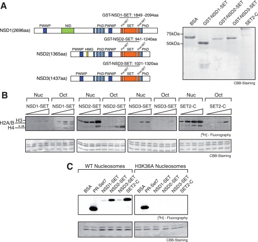 FIGURE 1. The NSD SET domain methylates H3K36 on nucleosomes. A, the left panel shows the schematic of human NSD1–3 domain organization. NID denotes the nuclear receptor interaction domain (12). PWWP denotes the PWWP domain which contains the proline-tryptophan-tryptophan-proline motif in the consensus amino acid sequence. The region of the SET domain protein expressed and used in the following enzymatic assays is indicated above the sequences. All of the proteins include the pre-SET, SET, and post-SET domain and flanking regions. The right panel shows CBB staining of the purified GST-NSD1–3 SET domain fusion proteins and the SET2 C-terminal fragment separated on SDS-PAGE. B, HKMT assay on nucleosomes (Nuc) and octamers (Oct) with enzymes analyzed in A using [3H]SAM as the methyl donor. The protein concentrations used for NSD1–3 SET were 0.05, 0.1, 0.2, and 0.4 μm; those for SET2-C were 0.01, 0.02, 0.04, and 0.08 μm. Nucleosomes and octamers contained recombinant, unmodified histones, and their final concentrations in the reactions were 0.35 μm unless otherwise noted. The assay mixtures were separated by SDS-PAGE. The lower panel shows CBB staining of the histones, and the upper panel shows results with fluorography. The asterisk denotes a proteolyzed form of H3 (see text). C, HKMT assays were performed on wild type (WT) or H3K36A nucleosomes using enzymes described in A; bovine serum albumin (BSA) and full-length recombinant PR-SET7 served as controls. The final concentrations for NSD1–3 SET in these and subsequent reactions were 0.15 μm unless otherwise noted.