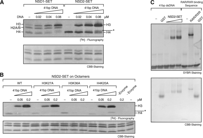 FIGURE 2. Short dsDNA stimulates NSD2-SET HKMT activity on H3K36 and inhibits activity on H4. A and B, increasing amounts of 41 bp dsDNA were added to HKMT assays containing octamers and NSD1-SET or NSD2-SET (A) or NSD2-SET with WT octamers or octamers bearing various lysine to alanine point mutations (B). Wild type (WT) octamers were used in the minus (−) enzyme controls. The bottom panels show CBB staining of histones. C, 0.4 μm 41 bp dsDNA was incubated alone or with 6 μm GST or with 0.3, 1.0, or 2.0 μm NSD2-SET domain. As positive control, RAR-RXR dimers were incubated with 0.4 μm oligo containing the RAR-RXR-specific DNA binding sequence. The products of the reaction were resolved by 5% native polyacrylamide gel electrophoresis. The upper panel shows the SYBR Gold stained DNA, and the lower panel shows CBB-stained proteins.