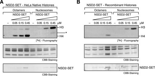 FIGURE 3. HKMT assay comparing octamers and nucleosomes assembled from HeLa native histones, bearing natural histone modifications (A) or recombinant histones without modifications (B). The amount of enzyme was titrated as indicated. The middle and bottom panels show CBB staining of histones and enzyme, respectively. The asterisk denotes a proteolyzed form of H3.
