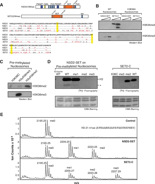 FIGURE 4. NSD2-SET domain dimethylates H3K36 on nucleosomes. A, a schematic representation of NSD2 and SET2 domain organization is shown on top, and the sequence alignment of the SET domains of NSD1–3 and SET2 is shown on the bottom. Identical residues are replaced by dots, similar residues are shown in black, and others are in red. The active site residues described in previous SET domain structures are highlighted in yellow. PWWP, PWWP domain containing proline-tryptophan-tryptophan-proline motif in consensus amino acid sequence. B, HKMT assays were performed with NSD2-SET and SET2-C on wild type (WT) and H3K36A nucleosomes using unlabeled SAM, and the product of the reaction was analyzed by Western blot using anti-H3K36me3 (upper panel) and anti-H3K36me2 (lower panel) antibodies. C, recombinant histones bearing methyl analogs mimicking different degrees of methylation on H3K36 were generated by chemical reaction as described under “Experimental Procedures” and analyzed by Western blot using anti-H3K36me2 and anti-H3K36me3 antibodies. D, premethylated histones were assembled into nucleosomes and used as substrates in HKMT assays with NSD2-SET (left panel) and SET2-C (right panel). Me1, monomethyl-H3ϕK36; Me2, dimethyl-H3ϕK36; Me3, trimethyl-H3ϕK36. E, MALDI-TOF mass spectra for chymotyptic digests of H3 (top panel), H3 methylated by NSD2 (middle panel), and H3 methylated by SET2-C (bottom panel). HKMT assays were performed on nucleosomes, and the products of the reaction were separated by SDS-PAGE. The H3 bands were excised and digested in-gel using chymotrypsin, and the resulting peptides were analyzed using MALDI-TOF MS. The calculated protonated monoisotopic masses of peptide 21–41 carrying zero to three methylations are 2195.25, 2209.27, 2223.28, and 2237.30, respectively. The asterisk denotes a proteolyzed form of H3.