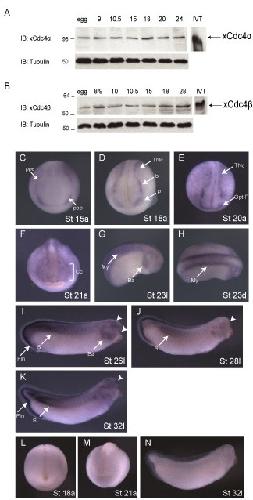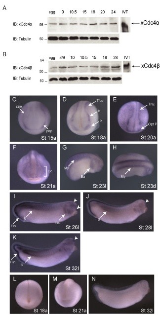 Figure 1. xCdc4α and xCdc4β protein are expressed throughout development, and transcripts accumulate in the neural crest and neural crest derived tissues. Expression of (A) xCdc4α and (B) xCdc4β in staged embryo lysates was determined by immunoblotting (IB) using anti-Cdc4 antibodies. In vitro translated (IVT) protein was used as a control. Equal loading was verified by IB for tubulin, with the equivalent of one embryo per lane loaded. (C-K) Developmental expression of xCdc4 was determined by whole mount ISH. At stage 15 (C), xCdc4 expression is detected broadly at the preplacodal ectoderm (ppe), in particular in the presumptive optic placode (pop) as well as in the prospective trunk neural crest (TNc). At late neurula stages (D,E), while xCdc4 transcripts continue accumulating in the trunk neural crest and optic placode (Opt P), xCdc4 is also detected in the cranial neural crest, particularly within the branchial aggregates (b). At stage 21 (F), xCdc4 is broadly detected in migrating cranial neural crest (Cc) and placodal regions. At stage 23 (G,H), xCdc4 is expressed in cranial neural crest that populates the branchial arches (Ba) and additionally in the myotome (My). At stage 26 (I), xCdc4 continues to be expressed in the myotome and branchial arches, as well as in several anterior placodes (arrowheads). xCdc4 is additionally expressed in the posterior fin mesenchyme (Fin). From stage 28 to 32 (J,K), xCdc4 expression is downregulated in the branchial arches, while persisting in the anterior placodal region (arrowheads), dorsal somites (s) and dorsal and ventral fin mesenchyme (Fin). Whole mount ISH at the indicated stages using xCdc4β sense probe confirms the specificity of the probe (L-N). Views in (C-N) are indicated bottom right after the stage (St): a, anterior view; d, dorsal view; l, lateral view.