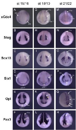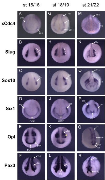 Figure 2. xCdc4 expression overlaps with expression of markers of neural crest and placodes. (A-R) Comparison of xCdc4 developmental expression (A,G,M) with the expression of neural crest and placodal gene markers in stage 15/16 (B-F), 18/19 (H-L) and 21/22 (N-R) embryos, as labeled. Asterisk indicates premigratory cranial crest; b, branchial crest; Cc, cranial neural crest; di, diencephalons; dlp, dorsolateral placodal area; Hg, hatching gland; h, hyoid crest; m, mandibular crest; me, mesencephalon; Nc, neural crest; Olf P, olfactory placode; Opt P, optic placode; plp, presumptive lens placode; pOlf P, presumptive olfactory placode; ppe, preplacodal ectoderm; pop, presumptive optic placode; s, somites; tel, telencephalon; TNc, trunk neural crest; yellow arrowhead, neural plate border region of the prospective rhombencephalon. Anterior view, dorsal up, stages as indicated.
