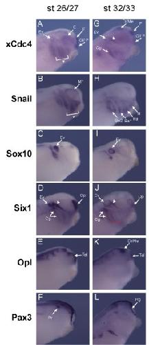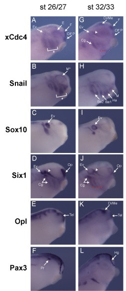 Figure 3. xCdc4 expression overlaps with expression of neural crest and placodal markers. (A-L). Comparison of xCdc4 developmental expression (A,G) with the expression of neural crest and placodal gene markers in the mid-tailbud stages 26/27 (A-F) and 32/33 (H-L). Arrowheads indicate the trigeminal placode; white asterisks indicate branchial arches; red asterisks indicate pharyngeal pouches. Ba1-2, branchial arches 1 and 2; Cg, cranial ganglia; Di/Me, diencephalon and midbrain boundary; E, eye; Ev, ear vesicle; F, forebrain; Ha, hyoid arch; Hg, hatching gland; M, mandibular arch; M*, mandibular crest surrounding the eye; Pr, profundal placode; Tel, telencephalon. Lateral view, anterior left, stages as indicated.