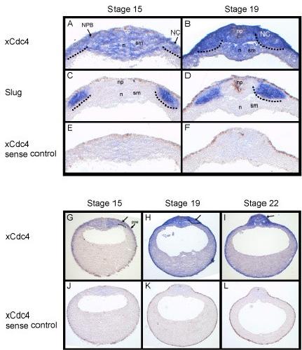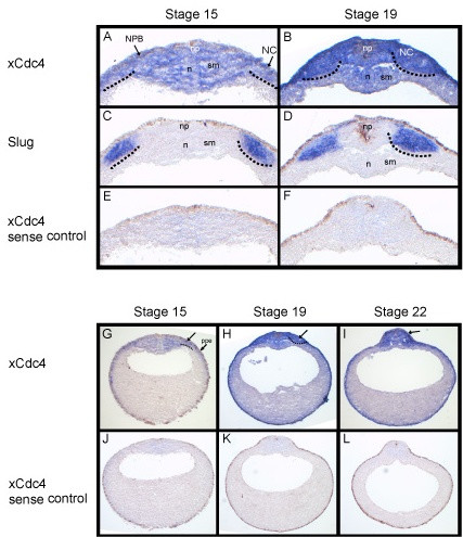 Figure 4. xCdc4 is found in ectodermal and mesodermal derivatives. (A-L) xCdc4 ISH on transverse sections of stage 15, 18 and 22 embryos (A,B,G-I), including sense control (E,F,J-L) and comparative Snail2 expression on stage 15 (C) and stage 18 (D) embryo sections. xCdc4 expression is detected in the neural crest (NC, black arrows), preplacodal ectoderm (ppe) and neural plate border (NPB) as well as in the neural plate (np). In addition to the expression in both superficial and deep layers of the ectoderm, there is also expression of xCdc4 in the notochord (n) and in somitogenic mesoderm (sm).