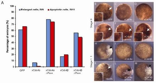 Figure 5. xCdc4α and xCdc4β block Cyclin E-mediated apoptosis, and this requires an intact F-box domain. Cyclin E mRNA (1 ng) was co-injected with 1 ng of other mRNAs as indicated into one cell of two-cell-stage embryos. (A) Embryos were scored for enlarged cells at stage 9 and apoptotic cells at stage 11 (n = 75-196). (B-M) Representative embryos from each injection are shown; enlarged cells are highlighted with white arrows (B,E-G,K) and shown enlarged in insets. Black arrows highlight apoptotic cells (H,L,M).