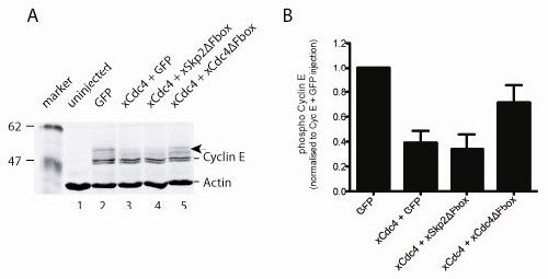 Figure 6. Phosphorylated Cyclin E protein is degraded by xCdc4. (A) Two-cell-stage embryos were injected with 1 ng of amino-terminally FLAG-tagged Cyclin E mRNA (lanes 2 to 5) and either 1 ng of GFP mRNA (lane 2) or 1 ng of xCdc4 mRNA (lanes 3 to 5). The ability of xCdc4δFbox to block Cyclin E degradation was examined by co-injecting 1.5 ng of xCdc4δFbox mRNA (lane 5), with 1.5 ng of GFP mRNA or 1.5 ng of Skp2δFbox mRNA as controls (lanes 3 and 4). Embryos were allowed to develop to stage 10.5 and immunoblotting was performed for the FLAG epitope, while immunoblotting of actin was performed as a loading control. IR-Dye™-conjugated secondary antibodies were used, enabling accurate quantification of Cyclin E and actin expression. (B) The level of phospho-Cyclin E was normalized to the level of actin, then compared to the level of phospho-Cyclin E in GFP-injected embryos, showing mean ± standard error of the mean from four independent experiments.