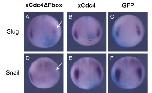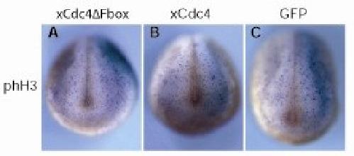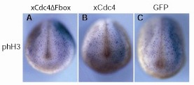 Figure 7. xCdc4δFbox does not affect the cell cycle. xCdc4δFbox or xCdc4 mRNA (1 ng) was injected into one cell of two-cell-stage embryos. GFP mRNA (1 ng) was injected as a control, and β-gal mRNA was injected as a lineage tracer (light blue unilateral staining). Whole mount antibody staining against phH3 was performed to detect mitotic cells. The average percentage difference in the number of mitotic cells on the injected side, compared to the uninjected side, was calculated as indicated in Materials and methods. Representative embryos are shown (anterior view, dorsal up, injected side right).