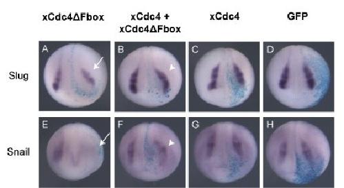 Figure 9. Loss of neural crest induced by xCdc4δFbox is rescued by co-injection of xCdc4. xCdc4δFbox mRNA (1 ng) was co-injected with either 1 ng of xCdc4 or 1 ng of GFP mRNA into one cell of two-cell-stage embryos. As controls, 1 ng of xCdc4 mRNA was co-injected with 1 ng of GFP mRNA, as well as injection of 2 ng of GFP mRNA as a separate control. β-gal mRNA was injected as a lineage tracer. (A-H) Embryos were allowed to develop to stages 18/19 and whole mount ISH was performed for the neural crest markers Snail2 (A-D) and Snail (E-H). Representative embryos are shown (anterior view, dorsal up, injected side right). Arrows indicate loss of expression of each marker on the injected side of xCdc4δFbox expressing embryos. The reduction in expression of each marker on the injected side of xCdc4δFbox expressing embryos is rescued by co-injection of xCdc4 mRNA (arrowheads).