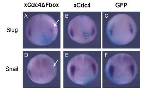 Figure 10. xCdc4δFbox inhibits neural crest specification. xCdc4δFbox or xCdc4 mRNA (1 ng) was injected into one cell of two-cell-stage embryos. GFP mRNA (1 ng) was injected as a control, and β-gal mRNA was injected as a lineage tracer (light blue unilateral staining). (A-F) Embryos were allowed to develop to stage 13/14 and the expression of Snail2 (A-C) and Snail (D-F) in the prospective neural crest region was examined by whole mount ISH. Representative embryos are shown (anterior view, dorsal up, injected side right). Arrows indicate loss of expression of each marker on the injected side of xCdc4δFbox expressing embryos.