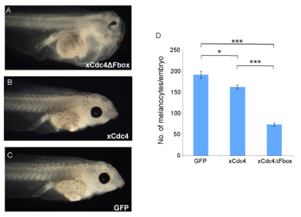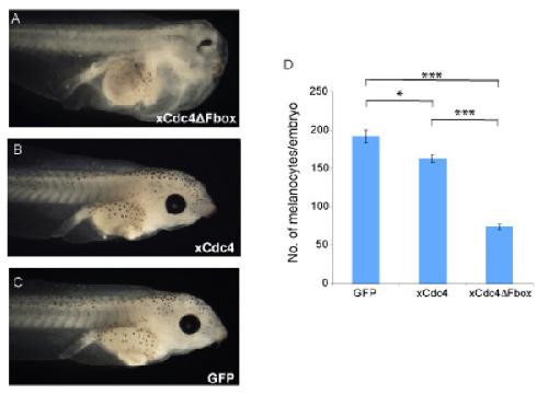 Figure 11. xCdc4δFbox impairs melanocyte development. xCdc4δFbox, xCdc4 or control GFP mRNA (0.5 ng) were injected into each of the two dorsal cells of four-cell-stage embryos. (A-C)Embryos were allowed to develop to stage 43 and subsequently the distribution and number of melanocytes were compared: xCdc4δFbox (A), xCdc4 (B) and GFP (C). (A-C) Representative embryos are shown (lateral views, anterior side right). (D)The average number of melanocytes for each condition was calculated and the mean ± standard error of the mean from two independent experiments are shown (n = 31 to 57). There was a significant decrease in the number of melanocytes following injection with xCdc4δFbox when compared to GFP or xCdc4 (***P << 0.0001), and a smaller decrease following injection with xCdc4 when compared to injection with GFP (*P < 0.01).