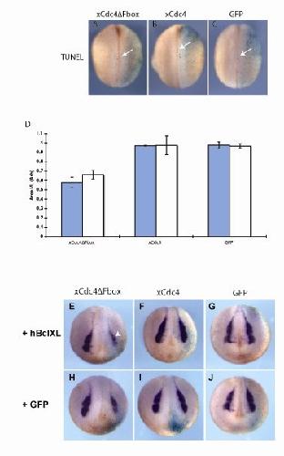Figure 12. xCdc4δFbox does not reduce neural crest by inducing apoptosis. (A,B) xCdc4δFbox or xCdc4 mRNA (1 ng) was injected into one cell of two-cell-stage embryos. (C) GFP mRNA (1 ng) was injected as a control, and β-gal mRNA was injected as a lineage tracer (light blue unilateral staining). Apoptosis was assessed using TUNEL staining. Arrow indicates TUNEL-positive cells. Representative embryos are shown (anterior view, dorsal up, injected side right). (D) The area of Snail2 staining on the injected side was expressed as a ratio of the area on the uninjected side, and for each experiment an average ratio was obtained (see Materials and methods). Mean ± standard error of the mean ratio from two independent experiments are shown (n = 57-82). (E-J) xCdc4δFbox, xCdc4 or GFP mRNA (1 ng) was injected into one cell of two-cell-stage embryos, along with 1 ng of hBclXL or 1 ng of GFP mRNA as indicated, with β-gal mRNA as a lineage tracer (light blue unilateral staining). Whole mount ISH for Snail2 was performed on stage 18 embryos. The reduction in expression of Snail2 on the injected side of xCdc4δFbox expressing embryos is not rescued by co-injection of hBclXL (arrowheads). Representative embryos from the indicated injections are shown (anterior view, dorsal up, injected side right).