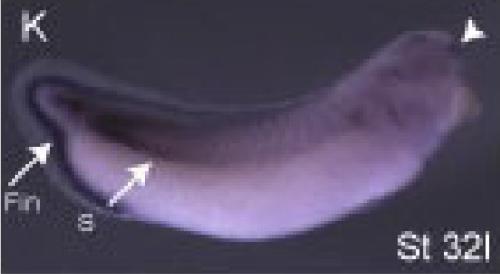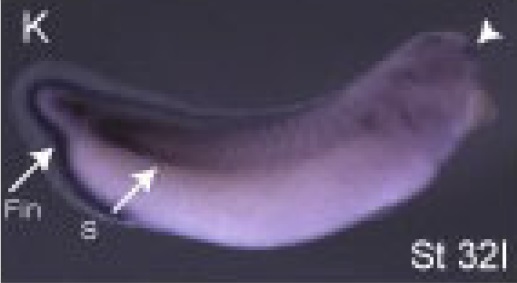 fbxw7 ( F-box and WD repeat domain containing 7, E3 ubiquitin protein ligase) gene expression in Xenopus laevis embryo, assayed via in situ hybridization, NF stage 32, lateral view, anterior right, dorsal up.