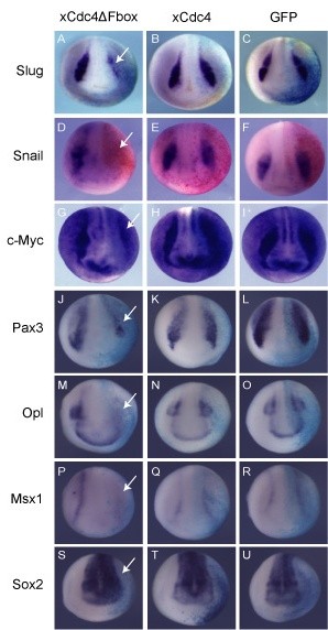 Figure 8. xCdc4δFbox inhibits neural crest development. xCdc4δFbox or xCdc4 mRNA (1 ng) was injected into one cell of two-cell-stage embryos. GFP mRNA (1 ng) was injected as a control, and β-gal mRNA was injected as a lineage tracer (light blue or red unilateral staining). (A-U) Whole mount ISH was performed for Snail2 (A-C), Snail (D-F), c-Myc (G-I), Pax3 (J-L), Opl (M-O) and Msx1 (P-R), and the early neuronal marker Sox2 (S-U). Representative embryos are shown (anterior view, dorsal up, injected side right).