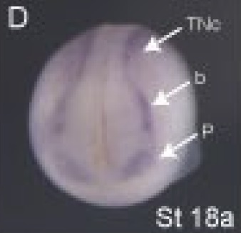 fbxw7 ( F-box and WD repeat domain containing 7, E3 ubiquitin protein ligase) gene expression in Xenopus laevis embryo, assayed via in situ hybridization, NF stage 18, anterior view, dorsal up.