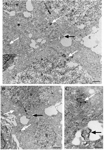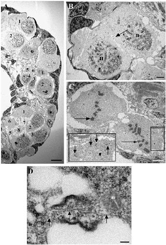 (white arrow) is facing the center of the cyst (B). PMC with mitochondrial cement (white arrow) facing the ring canal (black arrow) (C), nucleus (n). Scale bar