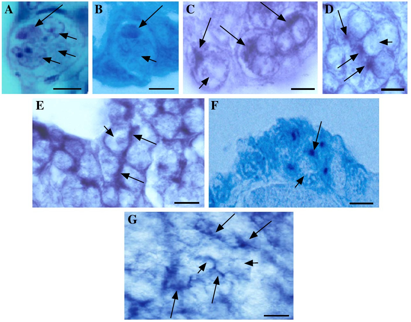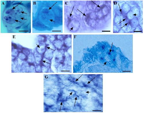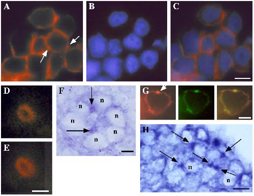 arrows), nucleus (n) (H). Light microscopy whole mount (AâE and G) and sections (F and H). Scale bar is equal to 10 Am in AâC, 500 nm in Dâ E, 7 Am in F,