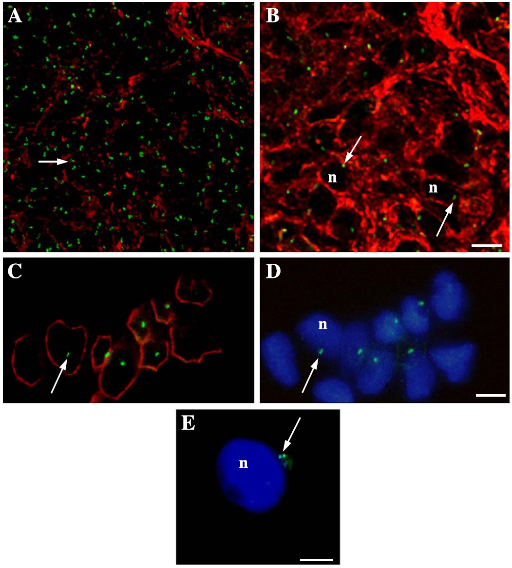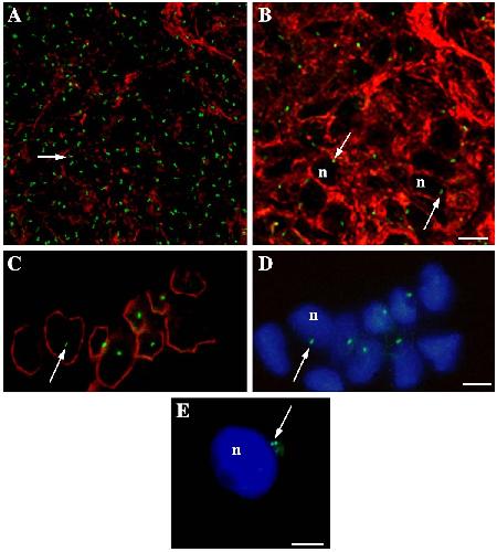 doublet (arrow) within the PMC, Hoechst-stained nucleus (n) (E). Scale bar is equal to 10 Am in A and B, 8 Am in C and D, and 5 Am in E.
