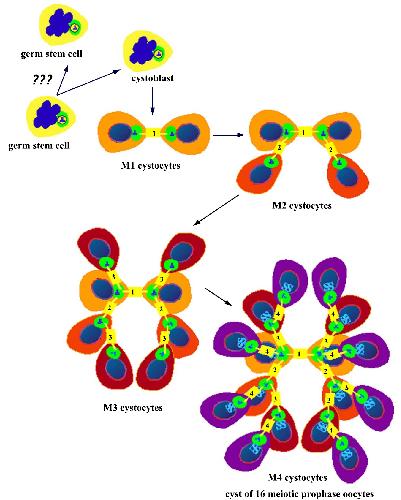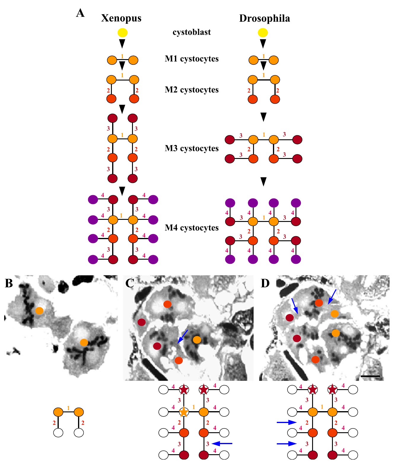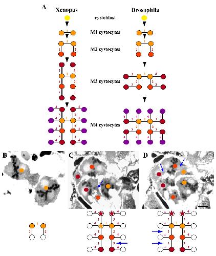 Drosophila. Numbers from 1 to 4 indicate successive generations of ring canals and cystocytes. Different colors indicate cystocytes of the same generation (A).
