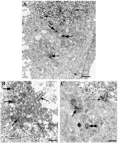 Thick arrow points to the mitochondrial cement of PMC, double arrow points to the centriole (B, C). Scale bar is equal to 900 nm in A and B, and 700 nm in C.