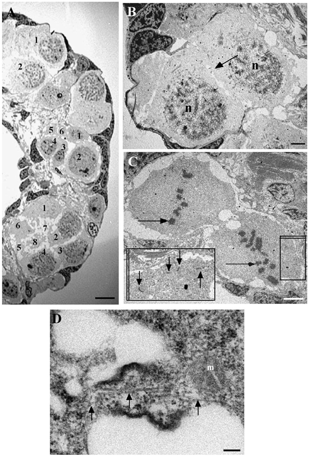 cystocytes. Numbers indicate individual cells visible in a given cyst (A). Two cystocytes connected by a ring canal (arrow), nuclei (n) (B). Two cystocytes in