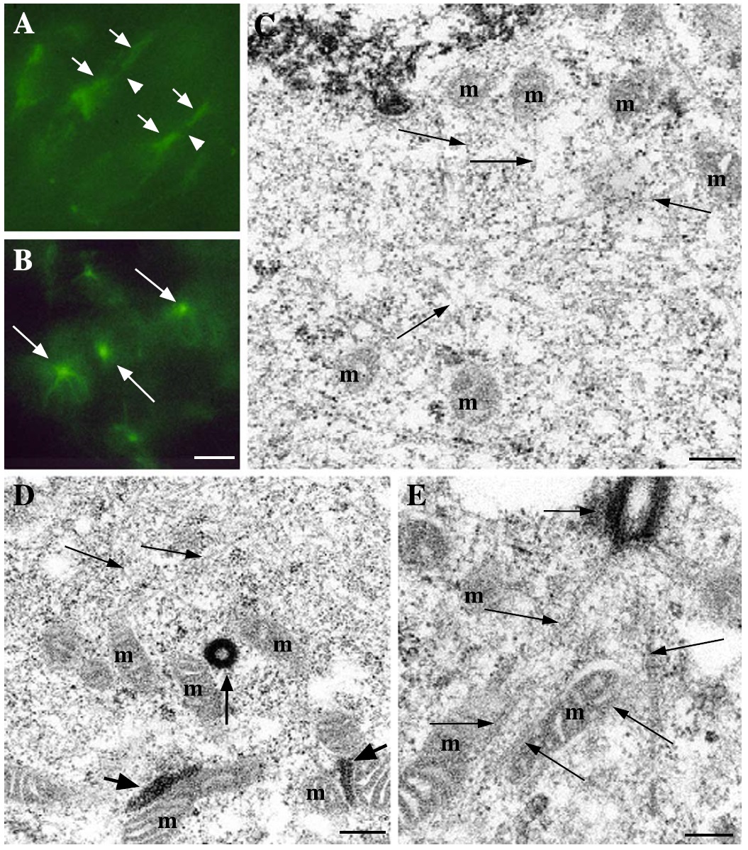 radiating from the centriole (short arrow) toward the mitochondria (m) (E). Scale bar is equal to 14 Am in A and B, 300 nm in C and D, and 200 nm in E.