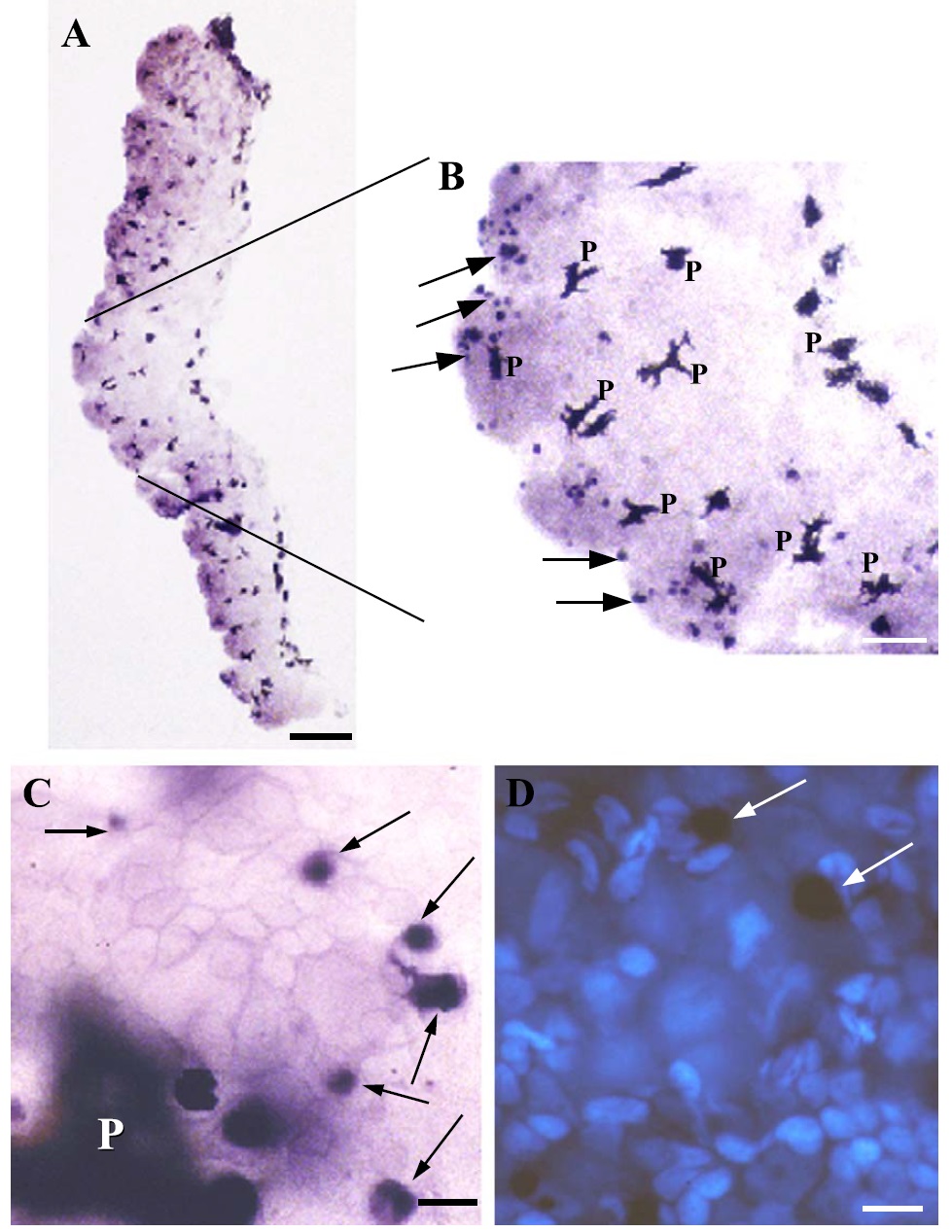 Fig. 12. Apoptosis in froglet ovary. Whole mount TUNEL staining. Whole ovary (A) and its fragments showing randomly distributed apoptotic cells (arrows)