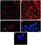 Fig. 2. Ring canals contain actin, kelch and hts. Fragment of a 16-cell cyst, stained for actin (red) with rhodamine-phalloidin. Arrow points to the ring canal (A).
