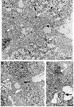 the center of the PMC between mitochondria (m) and mitochondrial cement (thick short arrows) (D). Fragment of PMC with the microtubules (arrows)